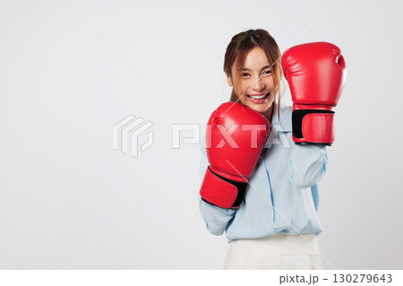 Boxing spirit and business strength blend in this smiling Asian young woman. She is ready to guard and fight, empowered by fitness and boxing passion. isolated studio white background