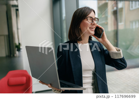 Close up shot of businesswoman talking over mobile phone and smiling, standing near office window and looking happy