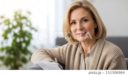 ソファの傍らに立つタイトスカートの美しく若い女性