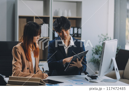 Entrepreneur Asian businessman and businesswoman discussing new business project in tablet in modern Meeting In Modern Office, Asian business casual concept.