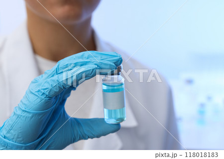 Glass bottle with vaccine in doctor's gloved hand on blue background, close up