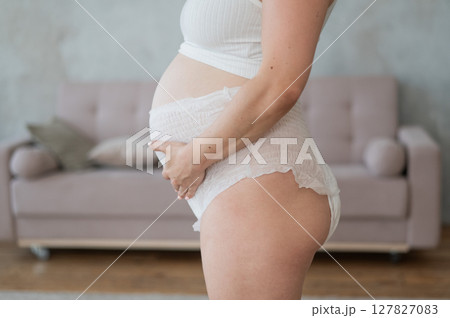 Caucasian pregnant woman in adult diapers suffers from incontinence. Close-up of belly.