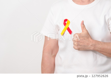 World hepatitis day awareness month, 28 July. elderly woman with Red and Yellow ribbon. Liver cancer, Jaundice, Cirrhosis, Failure, Enlarged, Hepatic Encephalopathy and Health concept