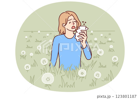 Woman sneezes because of allergy caused by dandelion blossoms and pollen from summer plants