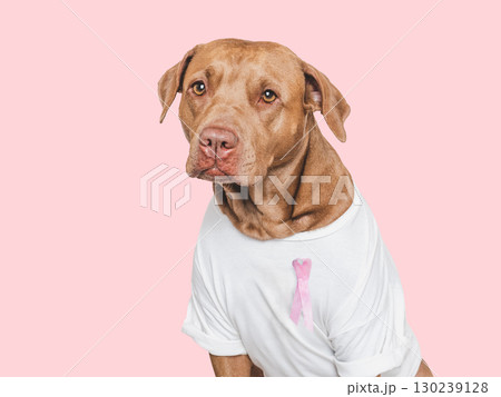 Cute dog and Pink Awareness Ribbon. Express moral support