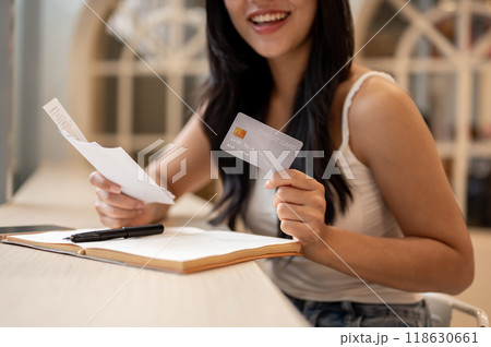 A close-up of a happy Asian woman holding a credit card and reviewing receipts at a table indoors.