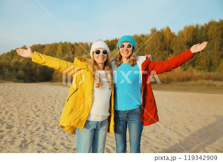 Happy joyful two women friends on sunny beach, stylish girlfriends smiles together on sea coast