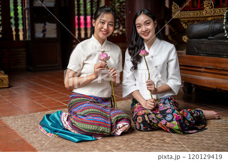 Beautiful Asian women in traditional dresses sitting in a temple, holding beautiful lotus flowers.