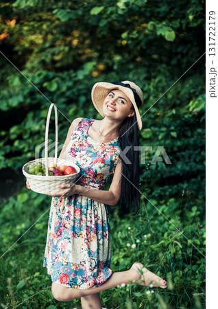 A woman in a light floral dress and a cute hat stands next to a pink rug on the grass