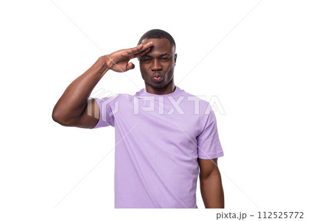 young charismatic 30 year old american man dressed in corporate lilac cotton t-shirt with print