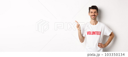 Handsome smiling volunteer in t-shirt pointing finger left, showing announcement, standing over white background