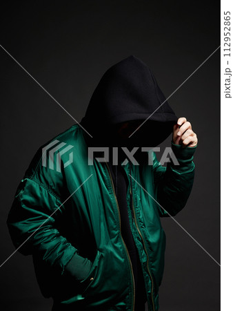 person in Black Hood and bomber jacket. Boy in a hooded sweatshirt
