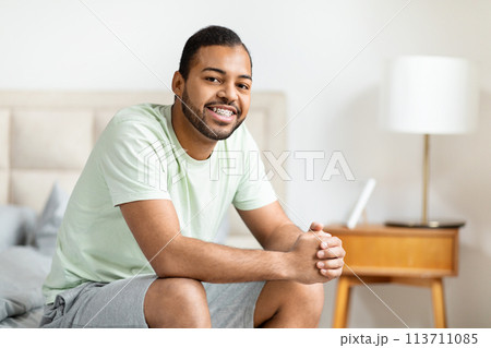 A young African American man is sitting on a bed, wearing casual sleepwear and stretching with a content smile