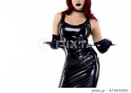Red-haired passionate lady in a black latex dress posing with a whip in her hands