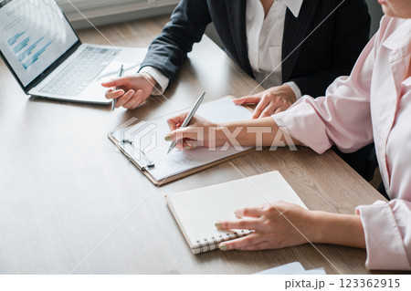 Two professionals collaborating in a modern office, analyzing data on a laptop and taking notes during a business meeting.