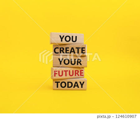 Future and development symbol. Wooden blocks with words You Create your Future today. Businessman hand. Beautiful blue background. Business and Future and development concept. Copy space.