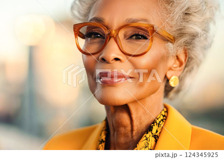 Elegant portrait of a confident senior woman wearing bold yellow glasses and gold earrings, gazing into the distance with a warm smile, radiating sophistication and style.