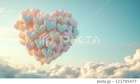 A heart-shaped balloon made of pastel-colored hearts floating in the sky, surrounded by fluffy clouds.