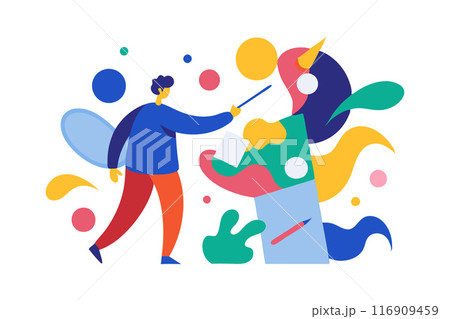 Colorful abstract illustration of a person interacting with a playful, creative design in a whimsical setting