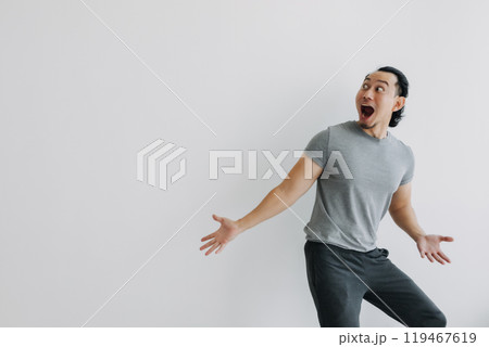 Emotion wow man In grey Isolated on white background. Full body Portrait.