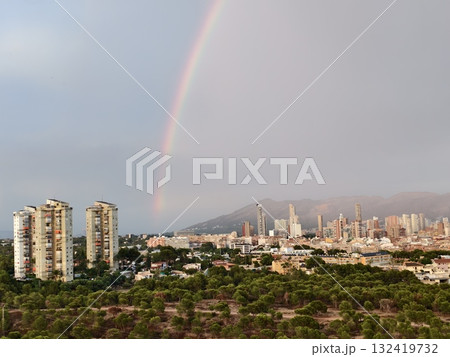 vivid rainbow scene, spectacular double rainbow arcs over vibrant coastal city scene with shimmering