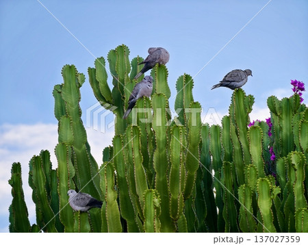 Birds on cactus, Trio of doves rests on lush cactus adorned with purple flowers amidst bright sunlight