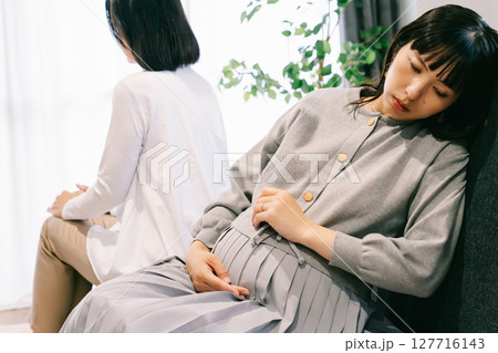 ベッドに寝転び肌着を挟んで赤ちゃんが待ち遠しい母と娘