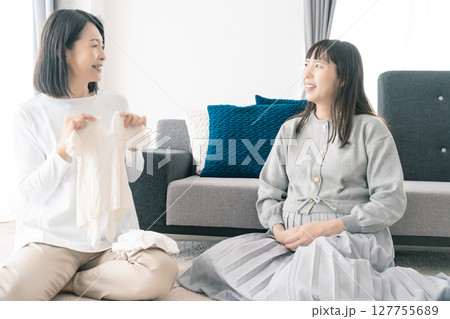 出産準備をしながら明るい未来の話をする母と娘
