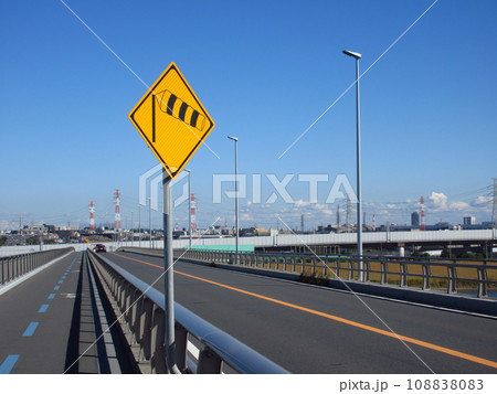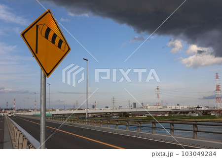 千葉県市川市の妙典橋に設けられた「道路標識(横風注意)」