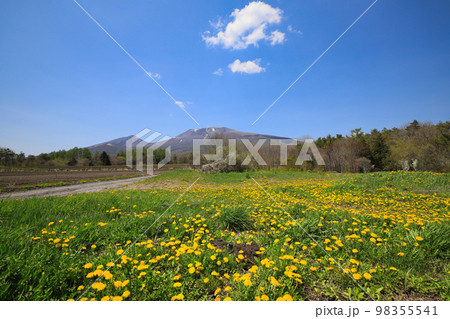 春の浅間山と満開のタンポポ/長野県北佐久郡軽井沢町