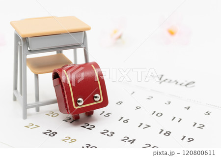 赤いランドセルと4月のカレンダー 小学校の入学式や始業式のイメージ写真