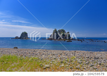 伊豆半島・南伊豆・逢ヶ浜(おうのはま)のイメージ、すずめ岩(雀岩)と姑岩・静岡県南伊豆町
