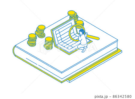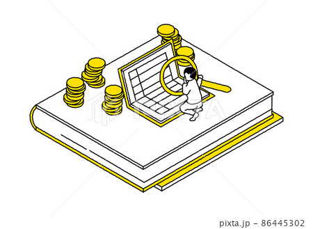 通帳を虫眼鏡でチェックする人のアイソメトリック図
