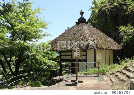 快晴の青空をバックに建つ長楽寺の茅葺屋根の詩読み堂