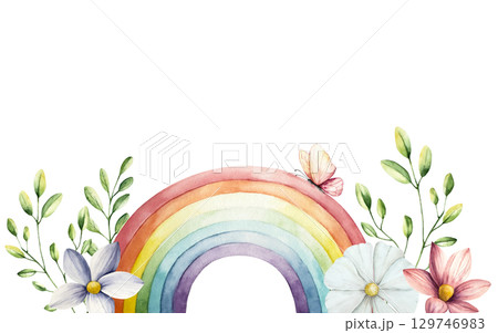 Watercolor hand drawn frame, border with rainbow. Magical clipart with Spring flowers and branches with leaves. Watercolor gerbera, chamomile, echinacea isolated on background, cartoon butterfly