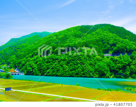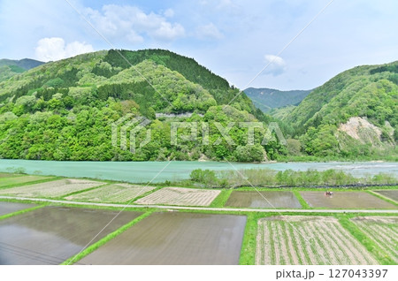 田植の済んだ田んぼと姫川第二ダムのダム湖の水面の色