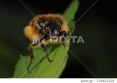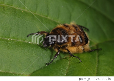 生き物 昆虫 ヒメトラハナムグリ、体長一センチほど。四角い翅の下から黄色の長い毛が盛大にはみ出します