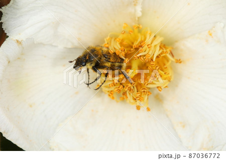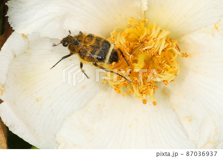 生き物 昆虫 ヒメトラハナムグリ、体長一センチ程。成虫は花粉食いで幼虫は朽木の中にいます