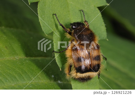 生き物 昆虫 ヒメトラハナムグリ、黒と茶色の縞模様。飛んでいる姿はハチのよう、ベイツ型擬態のひとつ