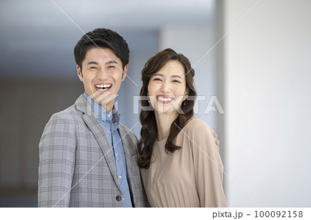 笑顔の30代のカップル カメラ目線 ポートレート 撮影協力「LINK FOREST」