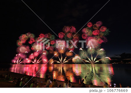 松江水郷祭 湖上花火大会 水面に映る花火