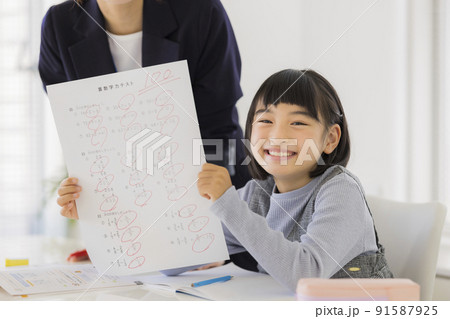 学習塾でテストの結果を喜ぶ女の子 小学生