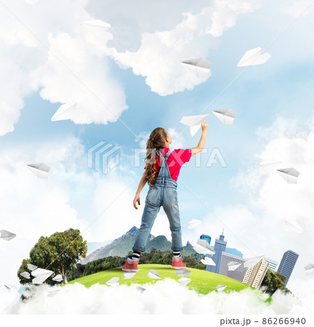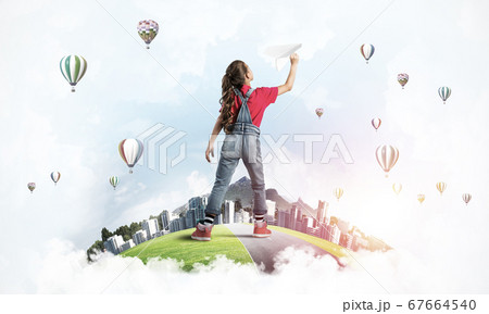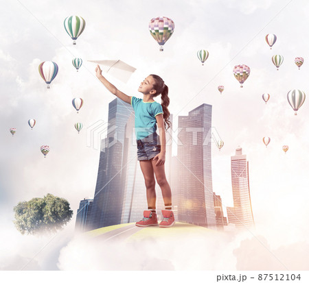 Concept of careless happy childhood with girl dreaming about future