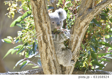 子コアラ。コアラの子どもが木の上に座って休んでいる。