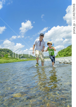 川で手を繋ぐ父と子供