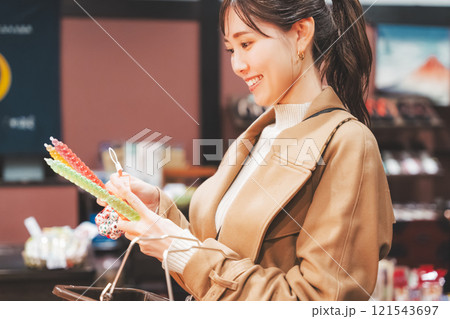 昔ながらの駄菓子屋で懐かしく買い物をする若い女性【撮影協力・お米・駄菓子屋 加賀田米穀店】