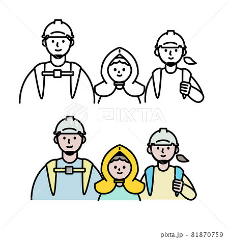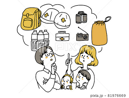 防災ヘルメット防災頭巾を被る家族イラスト素材