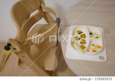 木製ハイチェアと手づかみ食べ用の離乳食の野菜が置かれたテーブル