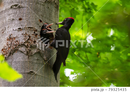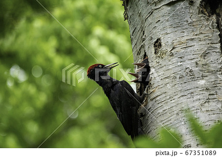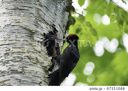 巣穴から顔を出すクマゲラの雛に給餌する親鳥