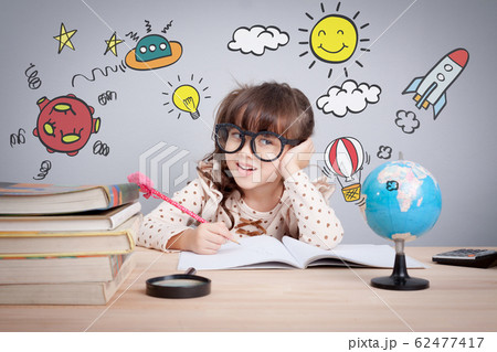 education concept , cute little happy girl at school making homework with creativity